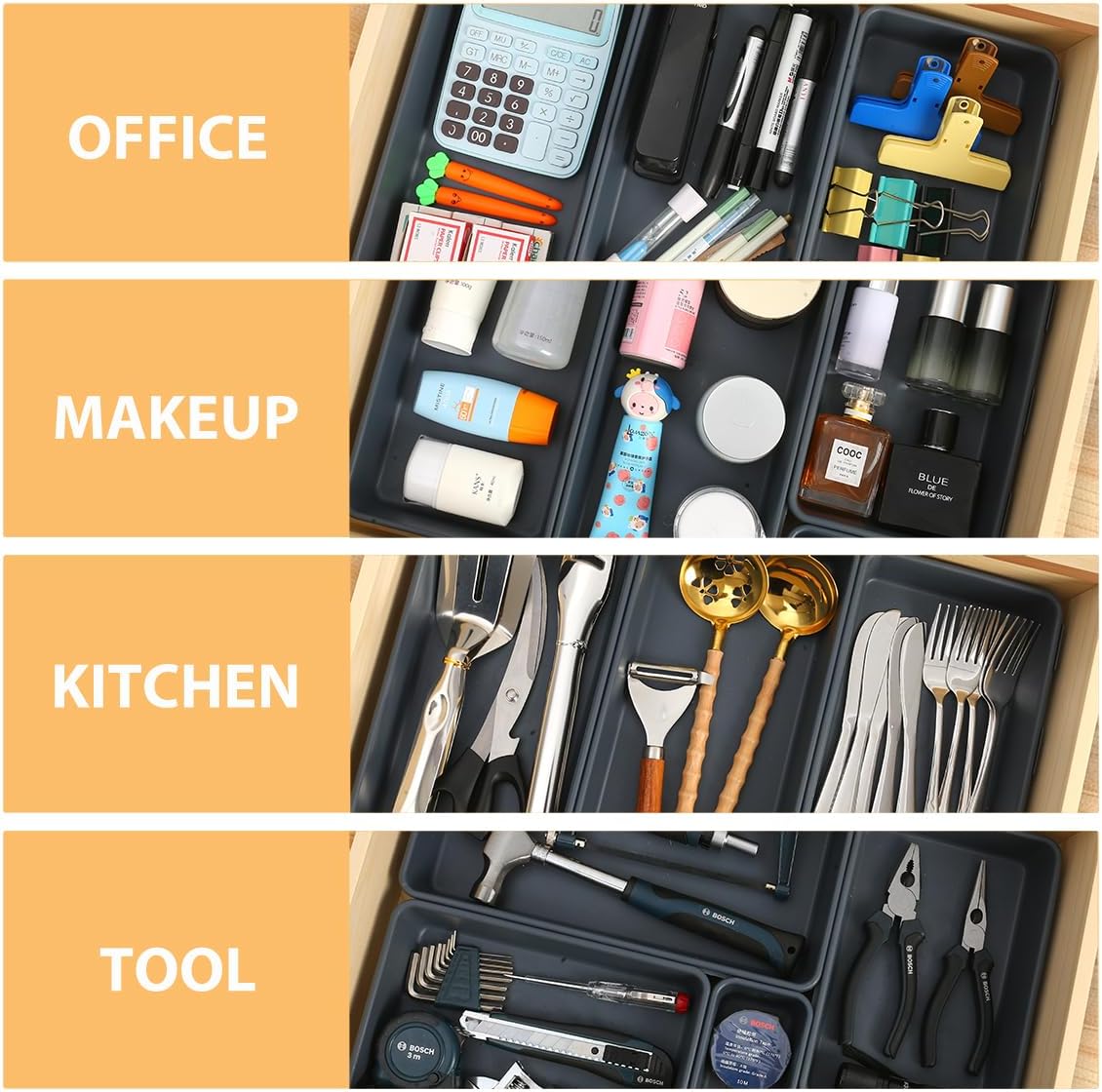 Multi-Purpose: These drawer organizers fit a variety of drawers and can be used in multiple scenarios, including the kitchen, bathroom, bedroom, and office. They are ideal for organizing cutlery, office supplies, makeup, makeup tools, accessories, and tools, helping you maximize your storage space.